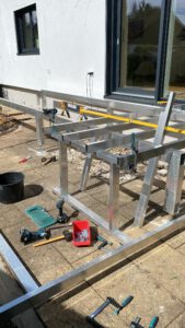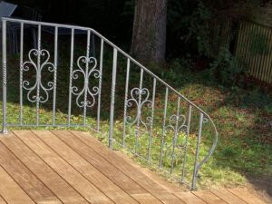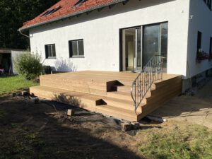 Omas kernsaniertes Haus sollte um eine aufgeständerte Holzterrasse aufgepeppt werden. Der Plan war, das alte schmiedeeiserne Geländer aus alten Zeiten zu übernehmen und die Sitzstufe/Treppe entsprechend zu gestalten. Als Deckbelag kommt Ipé ins Spiel. Ein sehr festes, schweres und dauerhaftes Holz. Zugegeben. Mein Lieblingsmaterial 😉