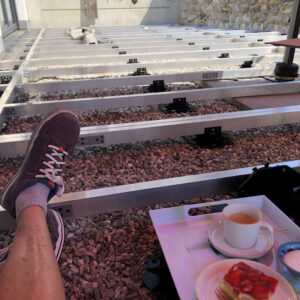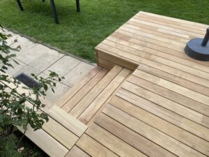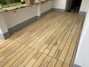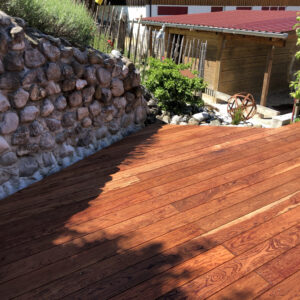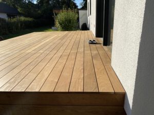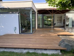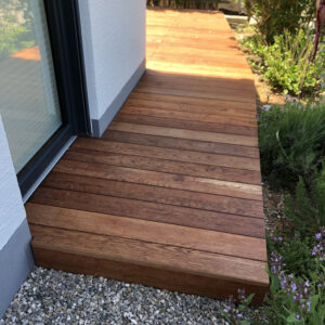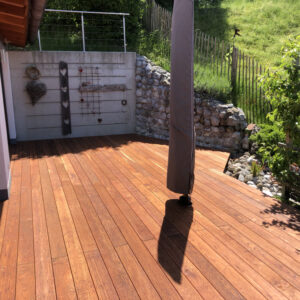 Ein Projekt mit einer sehr individuellen Form. Was passt besser dazu als ein ebenso individuelles Holz. Cumaru besticht duch seine rötliche Farbe und einer Festigkeit, die der Kappsäge eine Menge abverlangt hat. Dafür sollte die Fläche die nächsten 30 Jahre ohne größere Blessuren überstehen, Cumaru hat die höchste Dauerhaftigkeitsklasse.