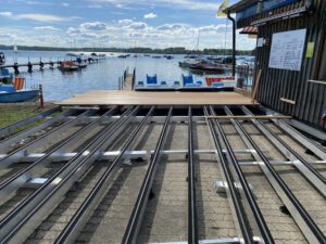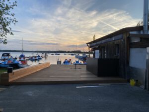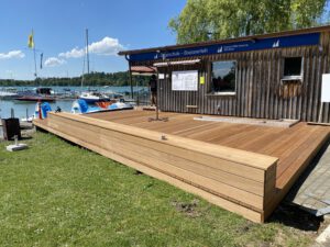 Der Bootsverleih am Wörthsee liegt so schön und bietet einen tollen Blick, egal ob tagsüber im Trubel oder am Abend – naheliegend, dort ein tolles Deck zu erschaffen, auf dem der Sundowner gleich noch mal besser schmeckt. Die Form orientiert sich an der etwas diagonal verlaufenden Hausfront. Die Unterkonstruktion besteht aus Aluminium, teils als Kreuzlage ausgeführt. Als Deckbelag wurde Bangkirai ausgewählt, der Klassiker unter den dauerhaften Tropenhölzern.