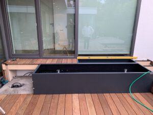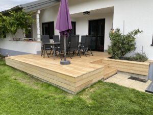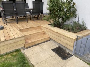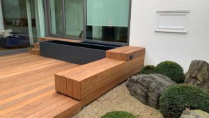 Wer mit einer Designerin in die Planung einer Terrasse geht, hat eine Menge Themen. Das Projekt hat jede Menge Spaß gemacht und das Ergebnis spricht denke ich für sich. Das Highlight, bestehend aus einer Kombination von Pflanzkübel und Wasserbecken umrahmt von einer verspielten Treppe und einem Daybed ist eine echte Wohlfühl-Oase und ein toller Platz zum Chillen. Der verwendete Deckbelag ist Ipé, als Unterkonstruktion kam Aluminium zum Tragen.